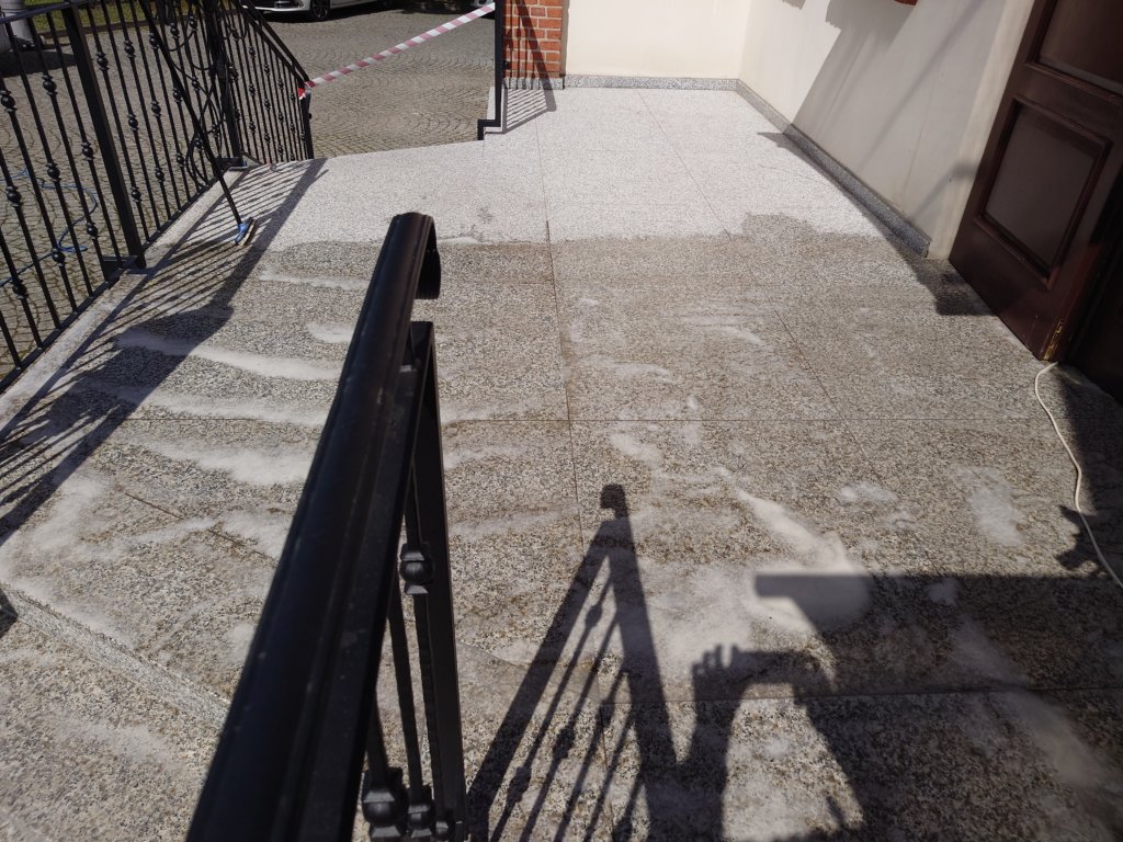 🌞 Z pierwszymi promieniami słońca wraca sezon na czyszczenie kostki brukowej, mycie paneli fotowoltaicznych i mycie elewacji! Tym razem pokazujemy realizację, w której wykonaliśmy mycie i impregnację schodów z kamienia naturalnego przed wejściem do budynku.
