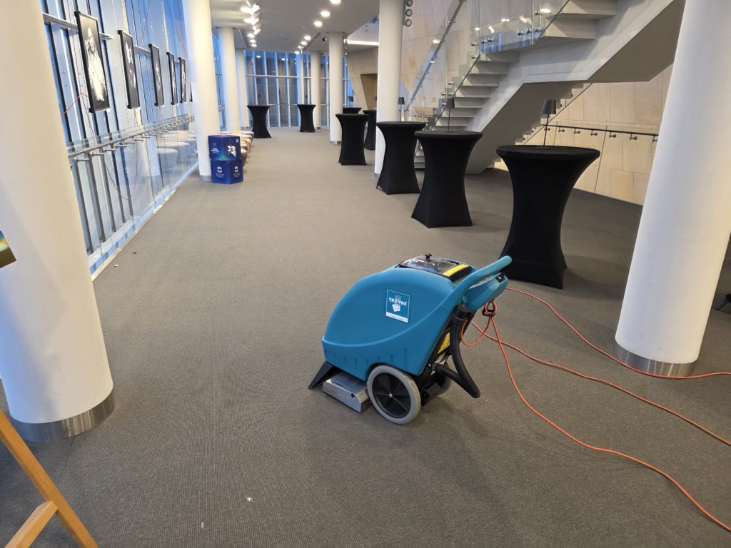 Dla jednego z naszych klientów wykonaliśmy ekspresowe pranie wykładzin biurowych tuż po zakończonym evencie. Kluczowym narzędziem, które pozwoliło nam osiągnąć doskonałe rezultaty w krótkim czasie, była specjalistyczna maszyna ekstrakcyjna Truvox Hydromist 35.